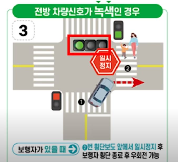 우회전의 교차로나 횡단보도가 녹색인 경우가 많으니 보행자가 횡단보도를 건너고 있을 때는 반드시 정지해야 합니다.