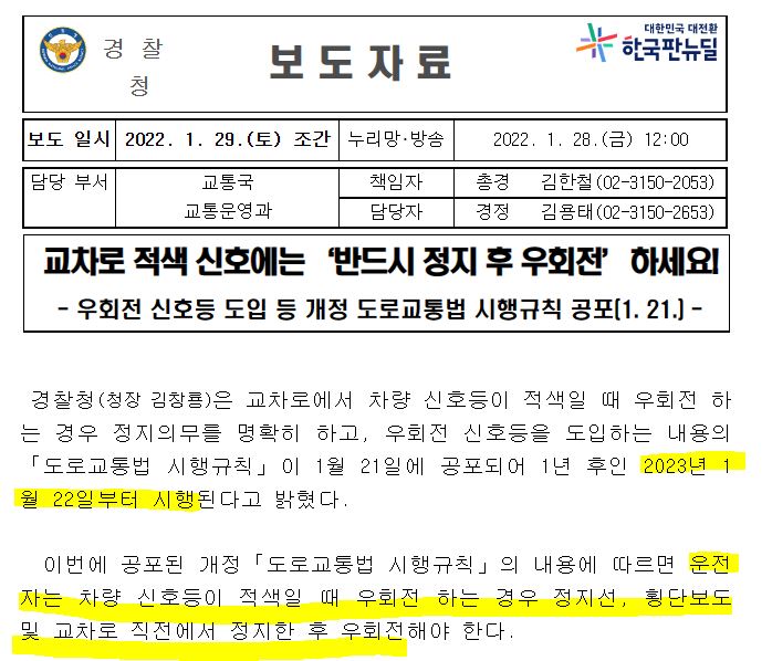 2022년 1월 29일 공포한 개정 도로교통법 시행규칙에 따르면 차량 신호등이 빨간 불일 때 운전자가 우회전 하는 경우 횡단보도, 교차로 직전에서는 반드시 정지한 후 우회전해야 합니다.