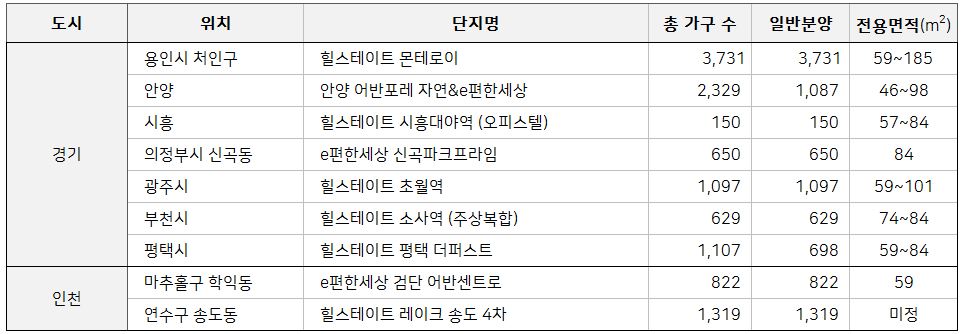 부동산 시장 분석 업체 부동산 인포에 따르면 12월 일반분양 기준으로 DL이앤씨, 현대건설, 현대엔지니어링 등 3개 건설사가 'e편한세상' '힐스테이트' 브랜드로 경기도 남부권과 인천을 중심으로 총 1만여 가구를 공급 예정입니다.