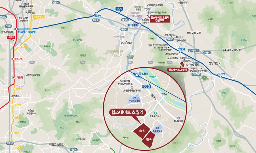 광주시 힐스테이트 초월역의 장점은 무엇보다 교통호재에 있습니다. 경강선 초월역에서 판교역까지 4 정거장으로 신분당선으로 환승하여 강남으로 이동하거나 이매역까지 3정거장으로 분당선으로 환승할 수 있습니다. 대중교통 외에도 단지 인근 성남이천로를 통해 판교 테크노밸리와 분당으로 빠르게 오갈 수 있고, 중부고속도로 곤지암IC를 통해 하남과 이천 등 수도권과 충청 지역으로 이동할 수 있습니다.