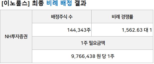 이노룰스 공모주 청약은 NH투자증권에서 단독 진행되어 청약경쟁률 781.22대 1, 청약증거금 1조4097억원을 기록하였습니다.