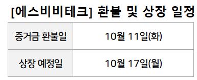 에스비비테크 증거금 환불인을 10월 11일(화), 상장은 10월 17일(화) 예정입니다.