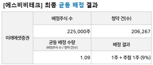 일반 투자자에게 배정된 주식 450,000주는 균등과 비례로 각각 50%씩 225,000주가 배정됩니다. 에스비비테크 총 청약 수는 206,267건으로 최소 청약 수량인 10주 이상 신청한 청약자들은 균등하게 1주를 받고 9% 확률로 추가 1주를 받을 수 있겠습니다.