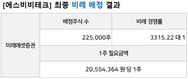에스비비테크 공모주 청약은 미래에셋증권에서 단독 진행되어 청약경쟁률 1657.61대 1, 청약증거금 4조6000억원을 기록하였습니다.