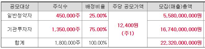 에스비비테크 전체 공모물량은 180만주입니다. 일반 투자자 배정 비율은 25%인 45만주이며 기관 투자자 배정 비율은 75%인 135만주입니다.