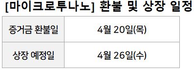 마이크로투나노 증거금 환불일은 4월20일(목), 상장은 4월 26일(수) 예정입니다.