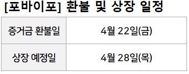 포바이포 증거금 환불일은 4월 22일(금), 상장은 4월 28일(목)입니다.
