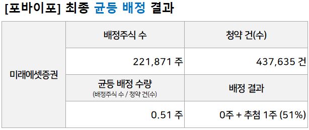 일반 투자자에게 배정된 주식 수 443,742주는 균등과 비례로 각각 50%씩 221,871주가 배정됩니다. 포바이포 총 청약 수는 배정 주식 수의 약 2배 가량 몰렸습니다. 즉, 최소 청약수량인 10주 이상 신청한 청약자들은 51% 확률로 균등 배정주식 1주를 받을 수 있겠습니다. 10명 중 5명은 한 주도 배정받지 못하는 상황이 올 수도 있습니다.