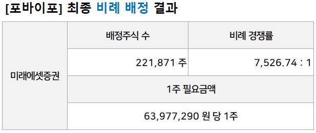 포바이포 비례 경쟁률은 7,526.74대 1로 압도적으로 높았습니다. 비례 배정 1주를 받기 위해 필요한 증거금은 약 6300만원입니다. 일반등급 기준 최고 청약한도인 44,000주, 3억 7400만원을 청약했다면 약 5.8주를 배정받게 되는 상황입니다.