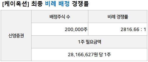 비례 경쟁률은 2816.66대 1로 1주를 받기 위한 증거금은 약 2800만원입니다. 1억원을 넣었을 때 비례 배정으로 약 4주 가량 받을 수 있겠습니다.