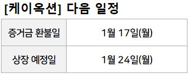 케이옥션 증거금은 1월 17일(월) 환불되고, 상장은 1월 24일(월)입니다.