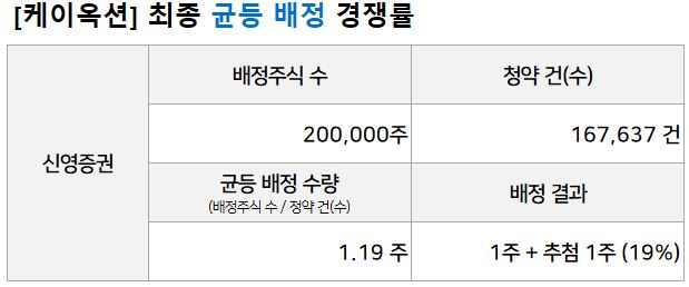 일반 공모 청약 물량 총 40만주 중 각각 절반씩 균등배정 20만주, 비례배정 물량이 20만주였습니다. 신영증권 단독으로 진행한 일반 청약의 청약 신청 건은 167,637 원으로 균등 배정 수량은 1.19주입니다. 청약 투자자 모두 안정적으로 1주를 받고 19% 확률로 1주를 추가 지급되어 2주를 배정 받을 수 있는 것입니다.