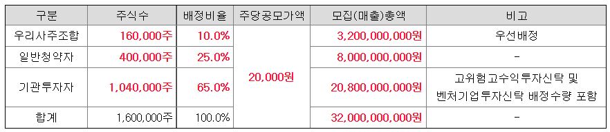 기관 투자자 대상 수요예측 결과 1638대 1의 경쟁률을 기록하며 공모가 밴드(17,000원~20,000원) 최상단인 20,000원으로 공모가를 확정하였습니다.