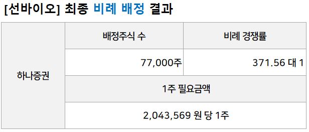 선바이오 공모주 청약은 하나증권에서 단독 진행되어 185.49 대 1를 기록하였습니다. 저조한 수요예측 결과에도 불구하고 일반 공모주 청약에서는 선전한 모습을 보였습니다.