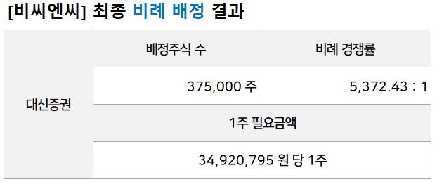 높은 비례 경쟁률을 기록하며 금일 마무리된 비씨엔씨 공모주 청약의 비례배정과 균등배정 수량 및 따상 정보 정리해 보겠습니다.