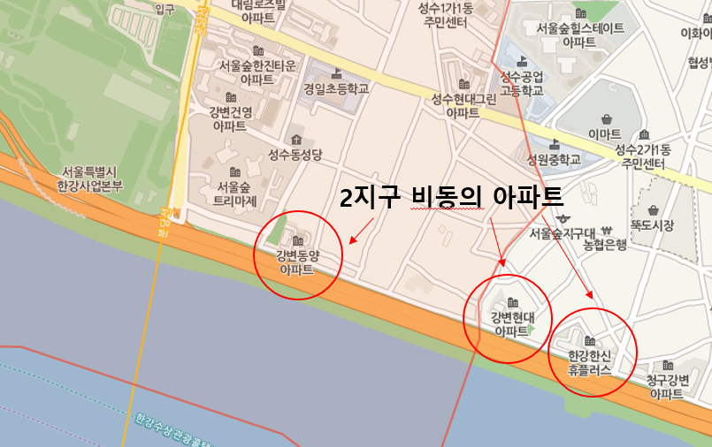 - 비동의 측: 상가와 아파트 (강변 동양, 강변 현대, 한강 한신)