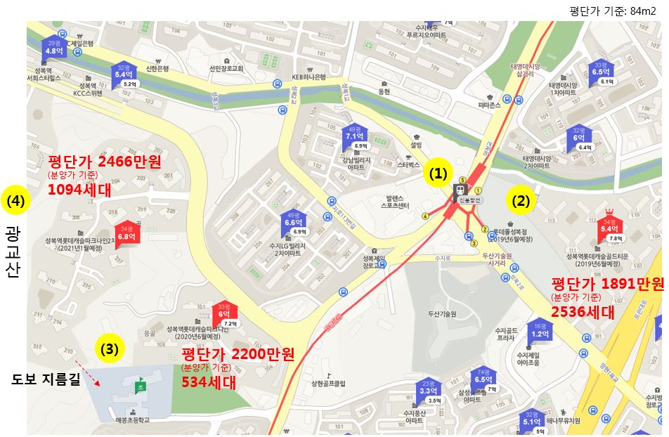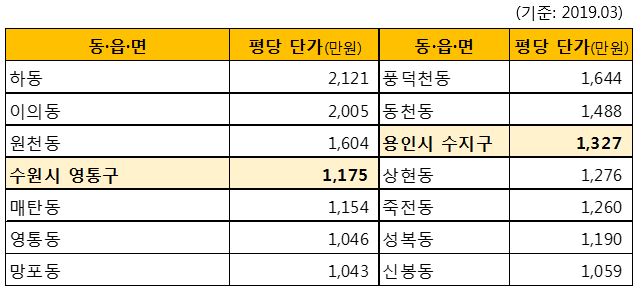 → 광교중앙역 인근 이의동과 하동의 신축 외에도 20년차 주공 아파트가 많은 영통동의 구축 아파트로 인해 평당 단가 낮은것으로 예상