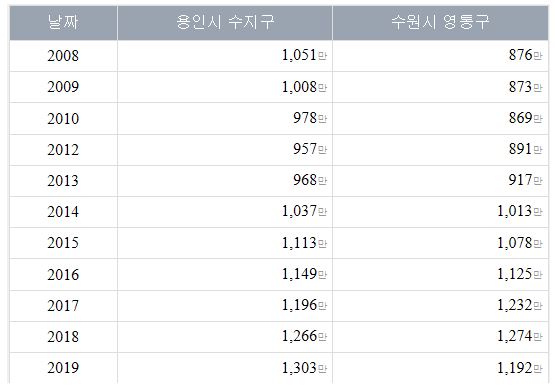 올 3월 기준 수원시 영통구와 용인시 수지구 동별 정보 결과 재미났습니다.