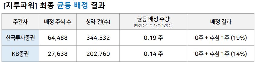 한국투자증권에서 최소 청약수량인 20주 이상 신청한 청약자들은 19%, KB증권은 14% 확률로 균등 배정주식 1주를 받을 수 있겠습니다. 일반 청약자 중 대부분 한 주도 배정받지 못하는 상황이 올 수 있습니다.