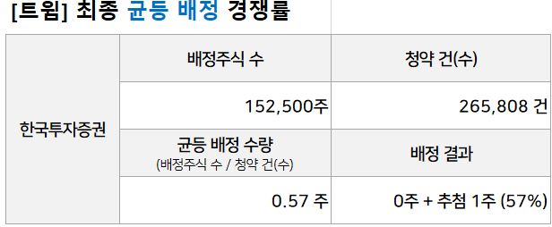 총 배정 주식 수 305,000주의 50%를 균등하게 나눠 배정 받는 균등 배정에서 청약 신청 건은 265,808건으로 균등 배정 수량은 0.57주입니다. 청약 투자자는 57% 확률로 1주를 지급 받을 수 있겠습니다.