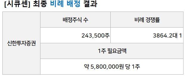 시큐센 비례 경쟁률은 3864대 1을 기록하며 비례 배정 1주를 받기 위해 필요한 증거금은 5,796,300원 즉 약 580만원입니다.