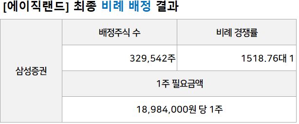 에이직랜드 청약은 삼성증권에서 단독 진행되어 청약 경쟁률 759.88대 1을 기록하였습니다.