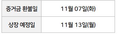 에이직랜드 증거금 환불일은 11월 7일(화), 상장은 13일(월)입니다.