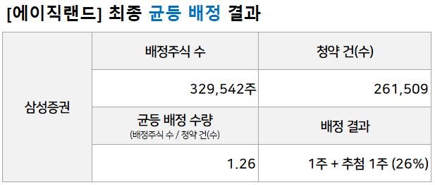 에이직랜드 청약은 삼성증권에서 단독 진행되어 청약 경쟁률 759.88대 1을 기록하였습니다.
