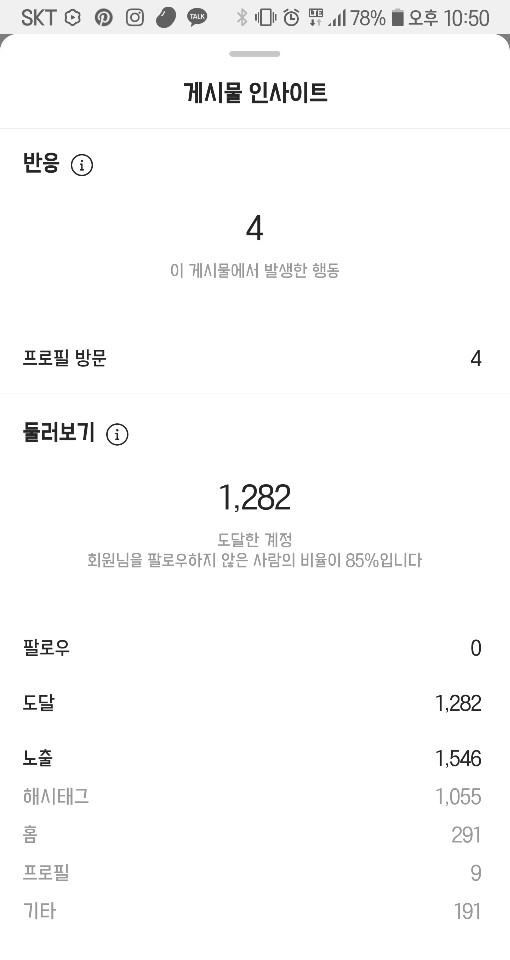 적절하게 작성된 해시태그로 유입된 게시물의 인사이트를 볼까요? 1000명 넘게 게시물 한 건을 본 사례입니다.