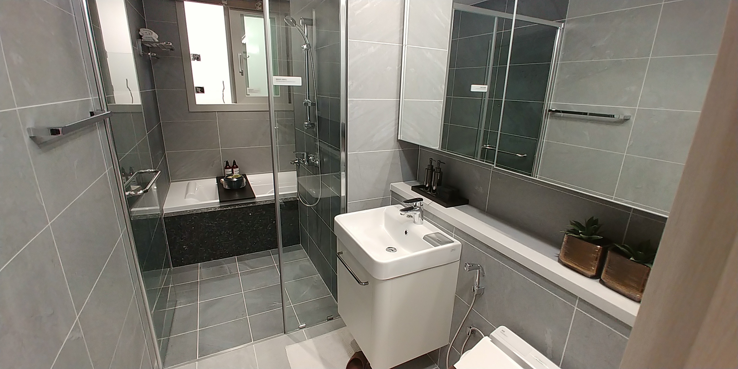변기와 세면도 / 샤워부스와 욕조를 분리한 구조는 좋으나 굳이 욕조와 샤워부스 둘 모두를 설치할 필요가 있었을까? 화장실 공간을 줄여서 오히려 드레스룸을 넓혔더라면 어땠을까?