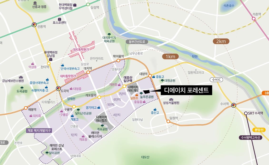 디에이치 포레센트는 삼성 서울방원 맞은 편에 위치하네요 인근 초등학교 중학교, 공원이 있고, 분당선 대모산입구역과 3호선 대청역과도 도보권/준역세권, SRT와 3호선 이용 가능한 수서역, 대치동 학원가 까지 각각 차로 20분 이내 갈 수 있는 거리라 '디에이치' 상품가치와 입지가치가 더해져서인가요?