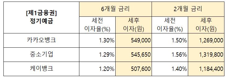 제1금융권 중 6개월 정기예금 금리가 가장 높은 은행은 카카오뱅크입니다. 세전 이자율 1.30%로 1억원 예치하였을 때 세후 이자는 약 549,000원입니다.