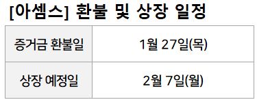 아셈스 증거금은 1월 27일(목) 환불되고 상장은 2월 7일(월)입니다.