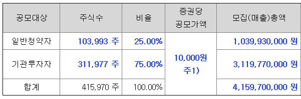 기관투자자 대상 수요예측 결과에서 510.36대 1을 기록하며 공모가를 희망범위 (11,000~13,500원)의 하단 보다 약 9% 하회하는 10,000원으로 확정하였습니다. 경쟁률이 510.36대 1이면 준수한 편이지만 참여한 기관 투자자의 절반 이상인 53.79%가 공모 하단가에 못 미치는 주문액을 적어냈기 때문입니다.