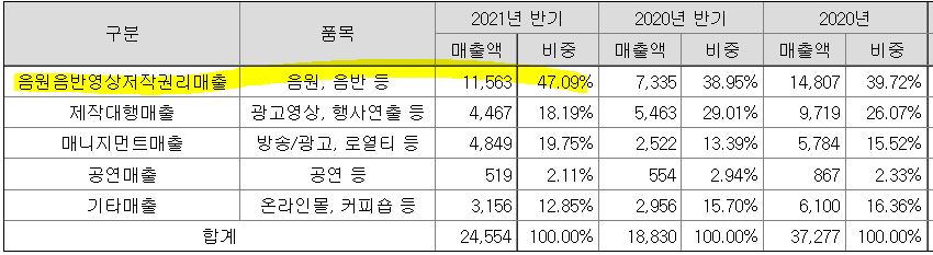 2020년 매출 272억원, 영업이익 76억원으로 최근 3년간 30~50%의 성장을 이뤘습니다. 2021년 상반기는 매출 345억원, 영업이익 45억원으로 전년 동기 대비 각각 매출 +30%, 영업이익 +71% 증가하였습니다. 코로나19 여파로 공연 매출은 감소했지만 음원·음반 저작권리 매출과 제작대행 매출이 증가하여 안정적인 성장세를 유지하고 있습니다.