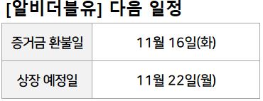 알비더블유 증거금은 11월16일(화) 환불되고, 상장은 11월 22일(월)입니다.