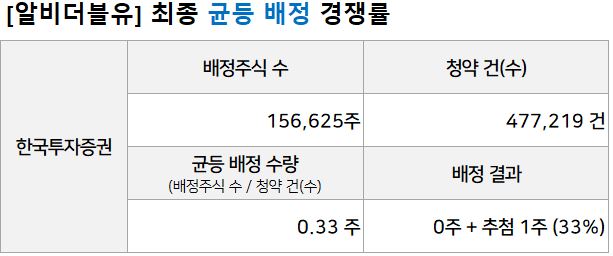 총 배정주식 수 313,250주의 50%를 균등하게 나눠 배정 받는 균등배정에서 청약 신청건은 477,219건으로 균등 배정수량은 0.33주입니다. 33% 확률로 1주를 지급 받을 수 있다는 것이지요. 카카오페이처럼 단독 균등 배정으로 진행되었으면 하는 아쉬움은 있습니다.