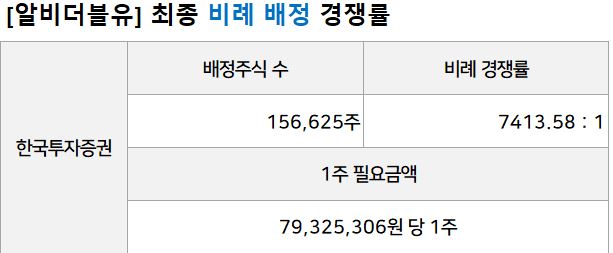 비례 경쟁률은 7413.58대 1로 1주를 배정받기 위한 증거금은 약 8000만원입니다. 비례경쟁률이 높지요. 전 5000만원을 넣었는데 균등으로 1주 받을 확률이 33% 밖에 되지 않는데다 비례 배정으로는 0주 당첨일 듯 합니다.