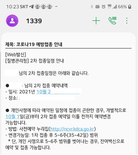 저도 10월 마지막 주 예정된 2차 접종이 1주 앞당겨졌다는 문자를 어제 받았습니다. 다행히 1주 단축된 날에 다른 일정이 없기는 하지만 다른 일정 있는 분도 분명히 있을텐데 사전 공지 없이 갑자기 문자를 받게되면 당황할 수 밖에 없을 것 같습니다.
