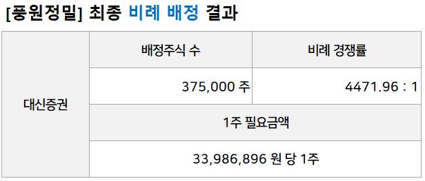 2월 28일(월) 상장 예정인 풍원정밀의 공모주 청약 비레배정과 균등배정 수량 및 따상 정보 정리해 보았습니다.