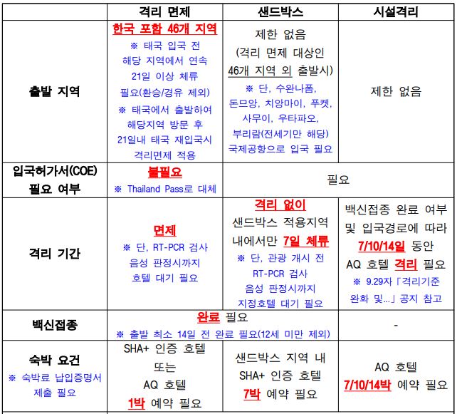 태국에서 출발하여 해당 지역 방문 후 21일 내 태국 재입국시 격리면제 적용