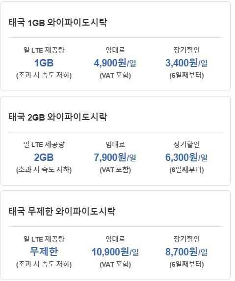인천공항에서 픽업 가능한 포켓 와이파이 대표 브랜드 '도시락' 요금제는 국가별로 다양하며 1~3GB, 데이터 무제한으로 구분되어 금액이 책정되어 있습니다. 태국의 경우 1일 LTE 제공량 1GB 기준으로 하루 4900원이며 6일 째 부터는 일 3400원으로 장기할인이 적용됩니다.