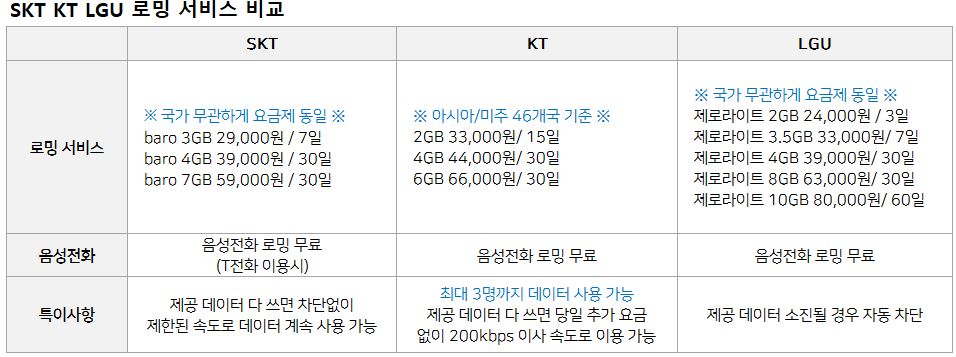 SKT 7GB 30일 기준 59,000원 요금제의 1일 이용요금은 1967원, LGU 8GB 30일 기준 63,000원의 1일 이용요금은 2100원, KT 6GB 30일 기준 66,000원의 1일 이용요금은 2200원입니다. 8GB 데이터량으로 비교하면 KT 로밍 요금제가 가장 저렴하네요.