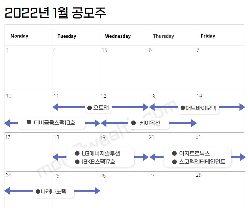1월 첫 째주는 공모주 청약 숨고르기 주간으로 이 기간 동안 IPO 예정 기업을 미리 분석하시며 괜찮은 종목을 골라 1월 공모주 청약 준비하시길 바랍니다.