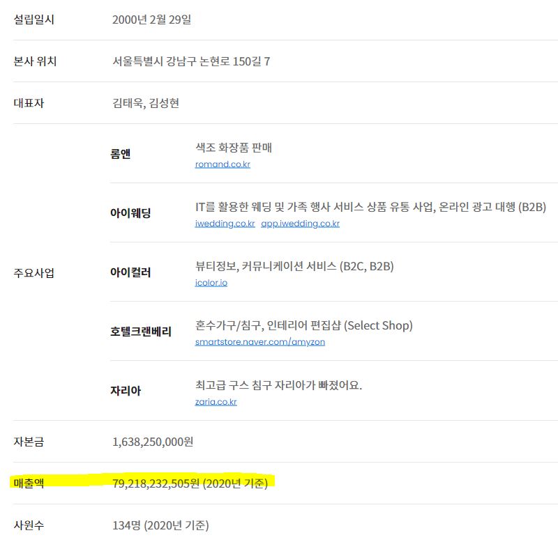 주요 사업으로는 색조 화장품 '롬앤' IT 활용한 웨딩 서비스 '아이웨딩,' 뷰티정보 서비스 '아이컬러,' 혼수가구/침구 인테리어 편집샵 '호텔크랜베리' 최고급 구스 침구 '자리아' 등 상호명처럼 패밀리 서비스가 있습니다.
