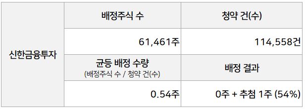 신한금융투자의 경우 배정주식 수 대비 청약 건수가 약 1.8배로 높아 균등 배정 수량은 0.54주였습니다. 10명 중 1명이 54% 확률로 1주 배정 받는 것이지요. 공동주관사로 공모주 청약이 진행될 경우 경쟁률이 낮은 기관에 청약해야 공모주 받을 수 있는 확률을 높일 수 있습니다.