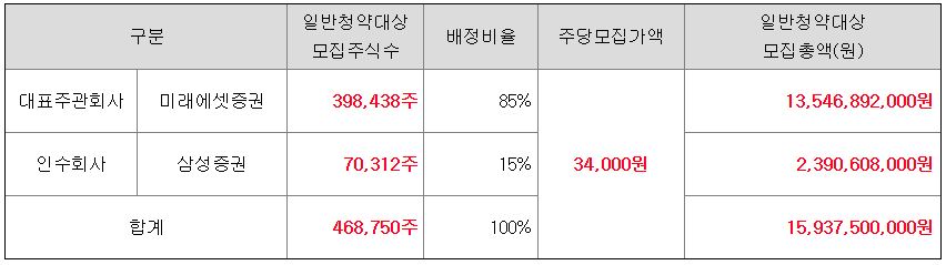 총 공모주 수량 1,875,000주 중 기관투자자 1,275,000주(68%) 일반투자자 468,750주 (25%) 배정되었습니다.