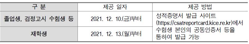 졸업생과 검정고시 수험생은 2021. 12. 10(금) 부터, 재학생은 12. 13(월)부터 성적증명서 발급사이트(https://csatreportcard.kice.re.kr)에서 발급 가능합니다.