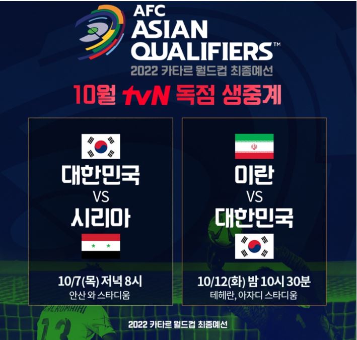 이란과의 A조 4차 경기는 tvN 독점 생중계로 우리나라 시간으로 10월 12일(화) 밤 10시 30분에 중계 방송을 시청할 수 있습니다.