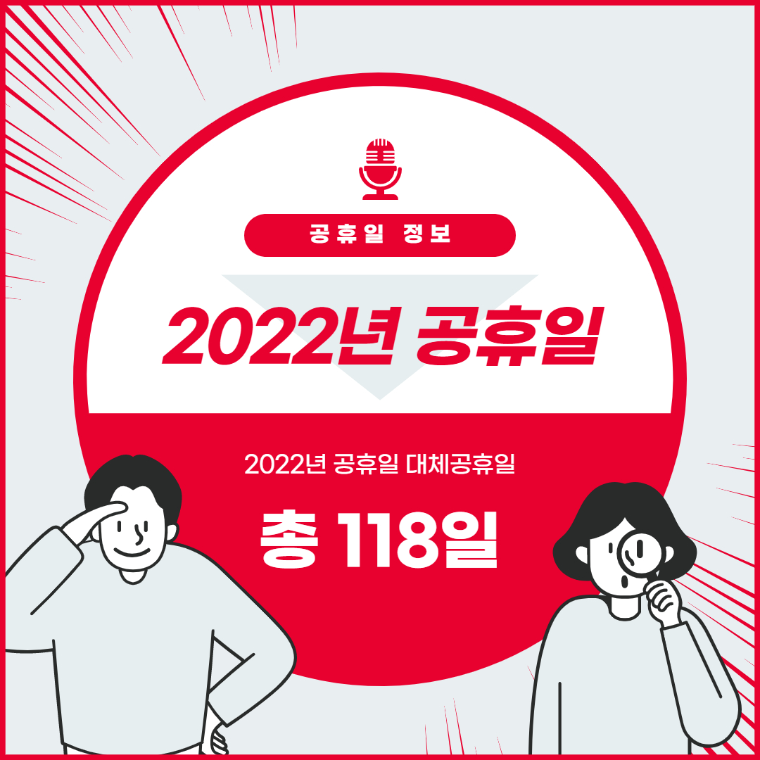 어느새 2021년도 한 달 정도 남았습니다. 다가오는 2022년을 맞이하며 지금 알아보아야 할 건 '공휴일' 정보가 아닐까요? 내년에는 올해와는 달리 추가되는 대체공휴일이 있다는 반가운 소식입니다. 결론부터 말씀 드리자면 대체공휴일까지 포함하여 2022년 쉬는 날은 총 118일입니다. 올해보다 쉬는 날이 2일이나 더 늘어난 셈이죠.